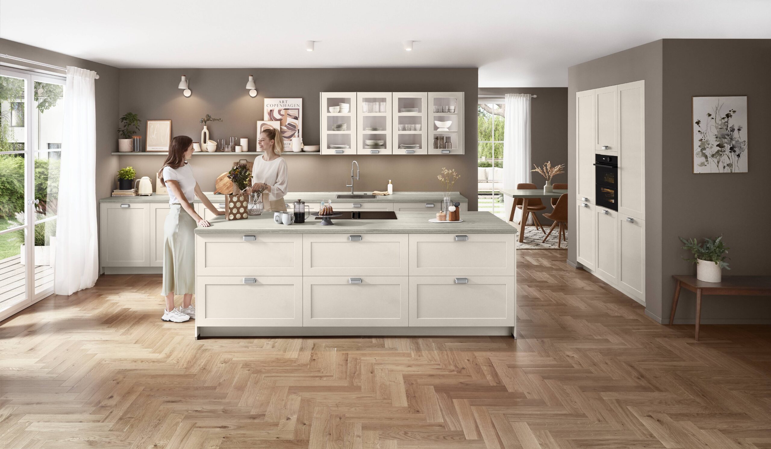 Helle Töne wie Cremeweiß, wohnliches Weiß, Greige oder Taupe schaffen Offenheit und Wärme. Die Materialien erzählen Geschichten: Massivholzer wie Eiche oder Buche für natürliche Wärme, Naturstein, Granit oder Quarz für robuste Beständigkeit. Ergänzt werden sie heute durch moderne MDF-Fronten mit hochwertiger Kunststoffbeschichtung, lackierte MDF-Lösungen oder Lacklaminatrahmen in Echtholzoptik. Sie verbinden die Haptik von Premium-Materialien mit bezahlbarer Eleganz und halten die klassische Küche zugänglich, ohne an Wertigkeit zu verlieren.