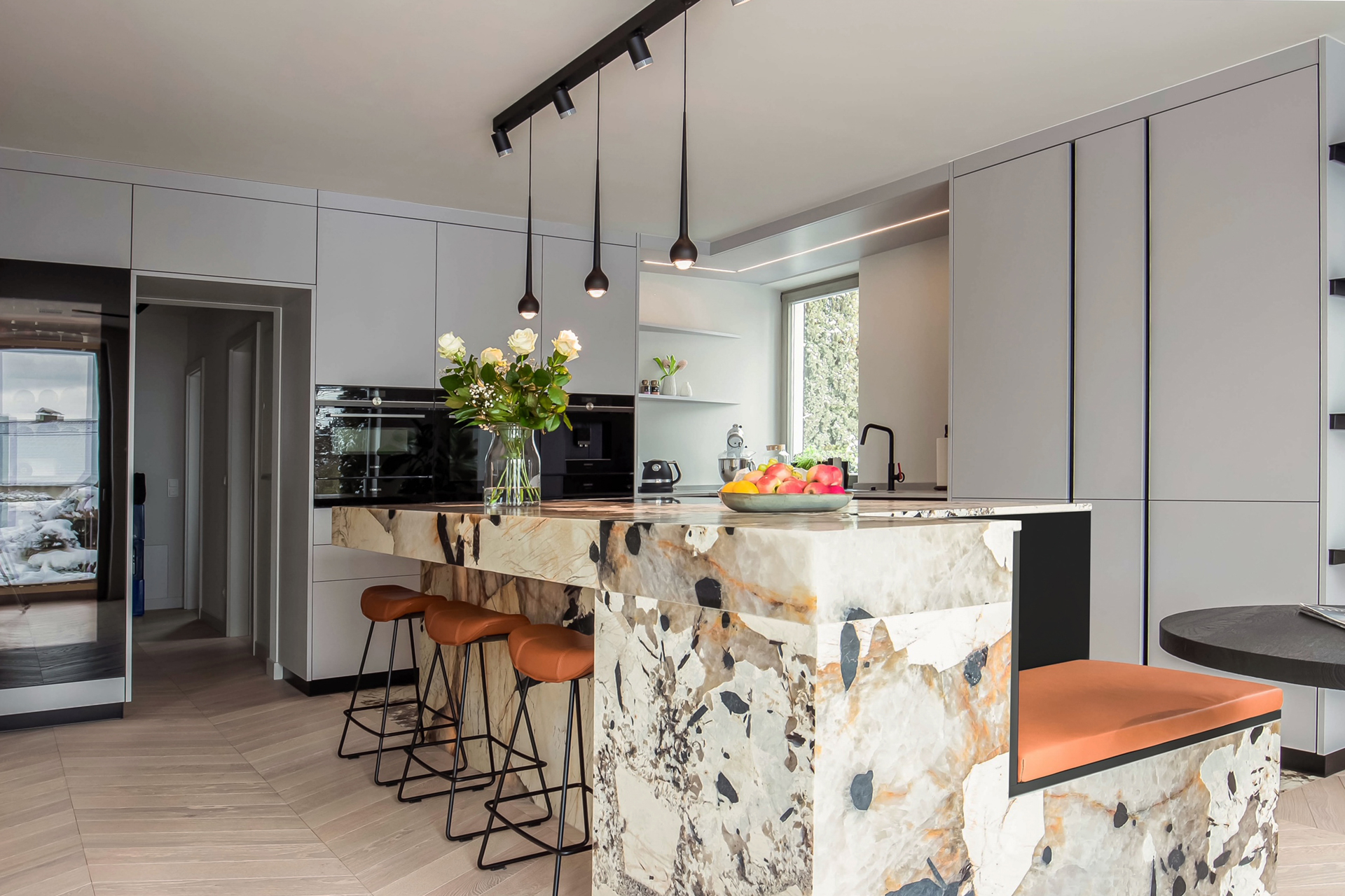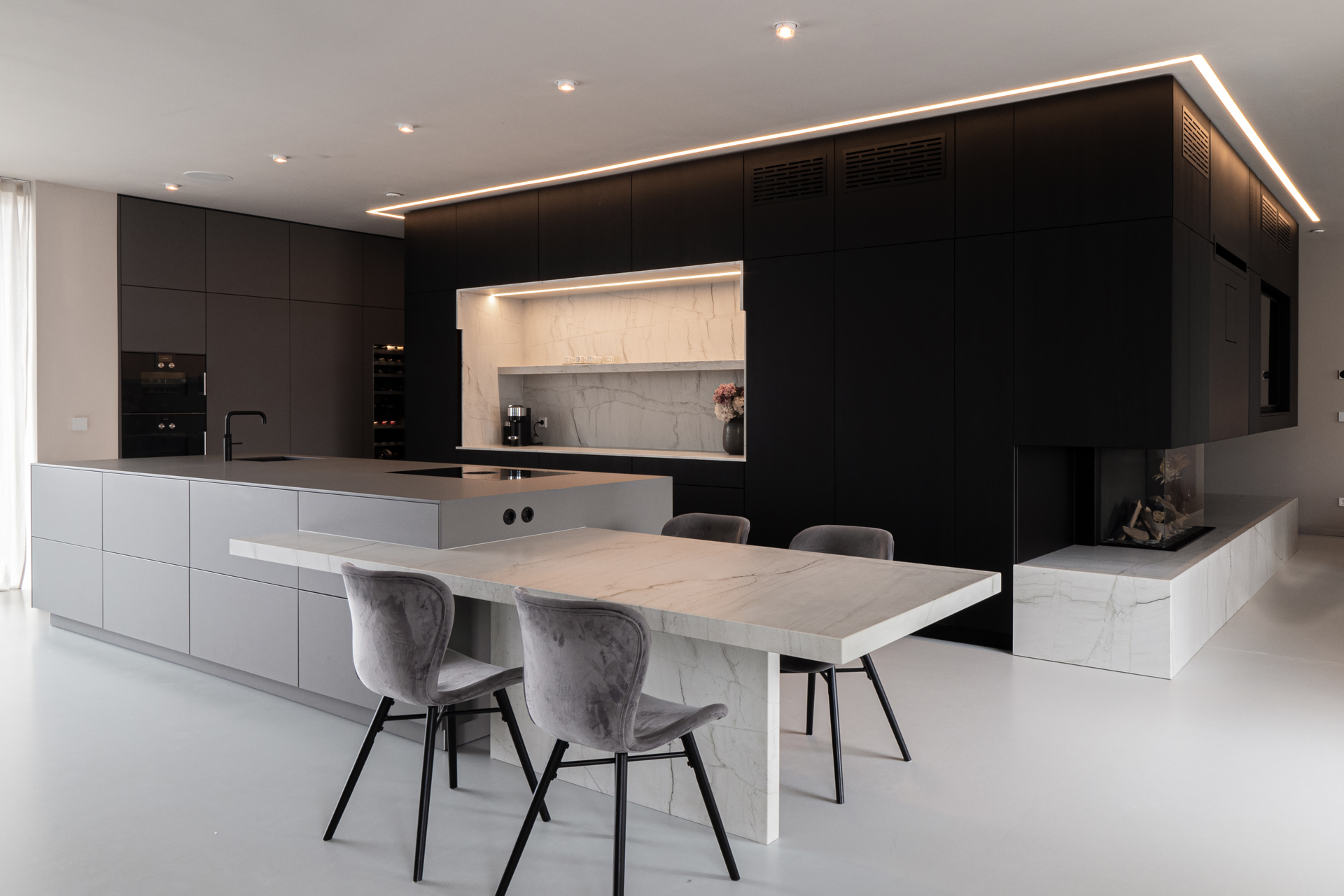 Dekton und Keramik erweitern die gestalterischen Möglichkeiten nochmals deutlich. Diese Materialien überzeugen durch extreme Robustheit, Hitzebeständigkeit und nahezu grenzenlose Designvielfalt. Sie ermöglichen großformatige, fugenarme Flächen und eröffnen neue gestalterische Freiheiten in der Küchenplanung. Optisch bewegen sie sich zwischen Naturstein-Anmutung und moderner Oberflächenästhetik und schaffen dadurch eine besonders hochwertige, architektonische Wirkung.